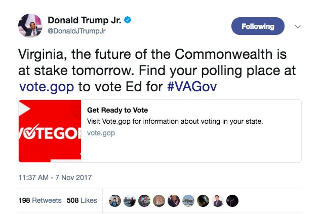 Donald Trump Jr. calls for people to vote in today's Virginia election "tomorrow" http://washex.am/2AqF2ls pic.twitter.com/12qmGhposi