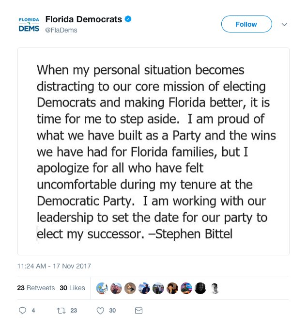 Florida Democratic Party chairman resigns over report he made women "uncomfortable" http://washex.am/2hzjsmx pic.twitter.com/pL9t8pEgpO