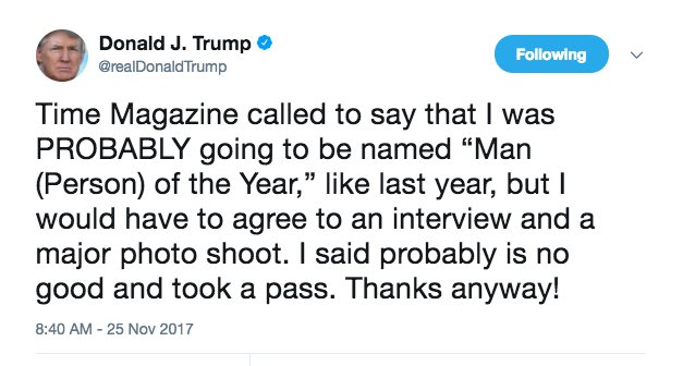 Trump claims he turned down Person of the Year honor from Time magazine http://washex.am/2hPclXh pic.twitter.com/LqQX1REsfA