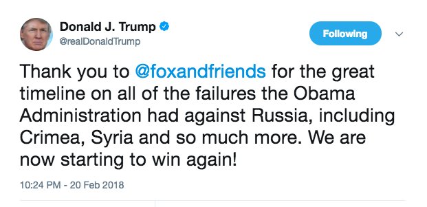 Trump thanks Fox for broadcasting timeline of Obama failures against Russia http://washex.am/2CwVL6o pic.twitter.com/Fsci8NLnp0