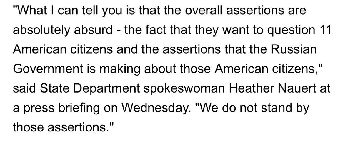 State Department spox Heather Nauert — a Trump political appointee and former Fox News host — called the Russian request “absolutely absurd.” Trump — and those who once worked for him — should say the same. http://thehill.com/homenews/administration/397763-state-dept-russias-allegations-about-american-citizens-absolutely …pic.twitter.com/35CI695cdl