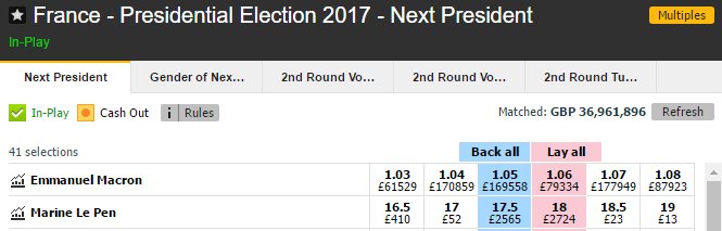 #frenchelection odds to new low. Now 1.05 or 95% likely. Nearly £37M matched. http://btfr.co/117179983 pic.twitter.com/PdsL8eZWOY