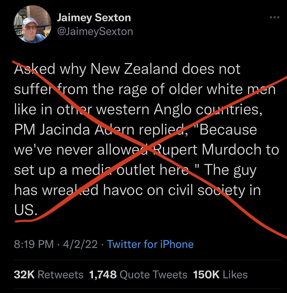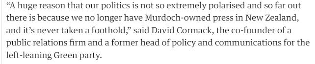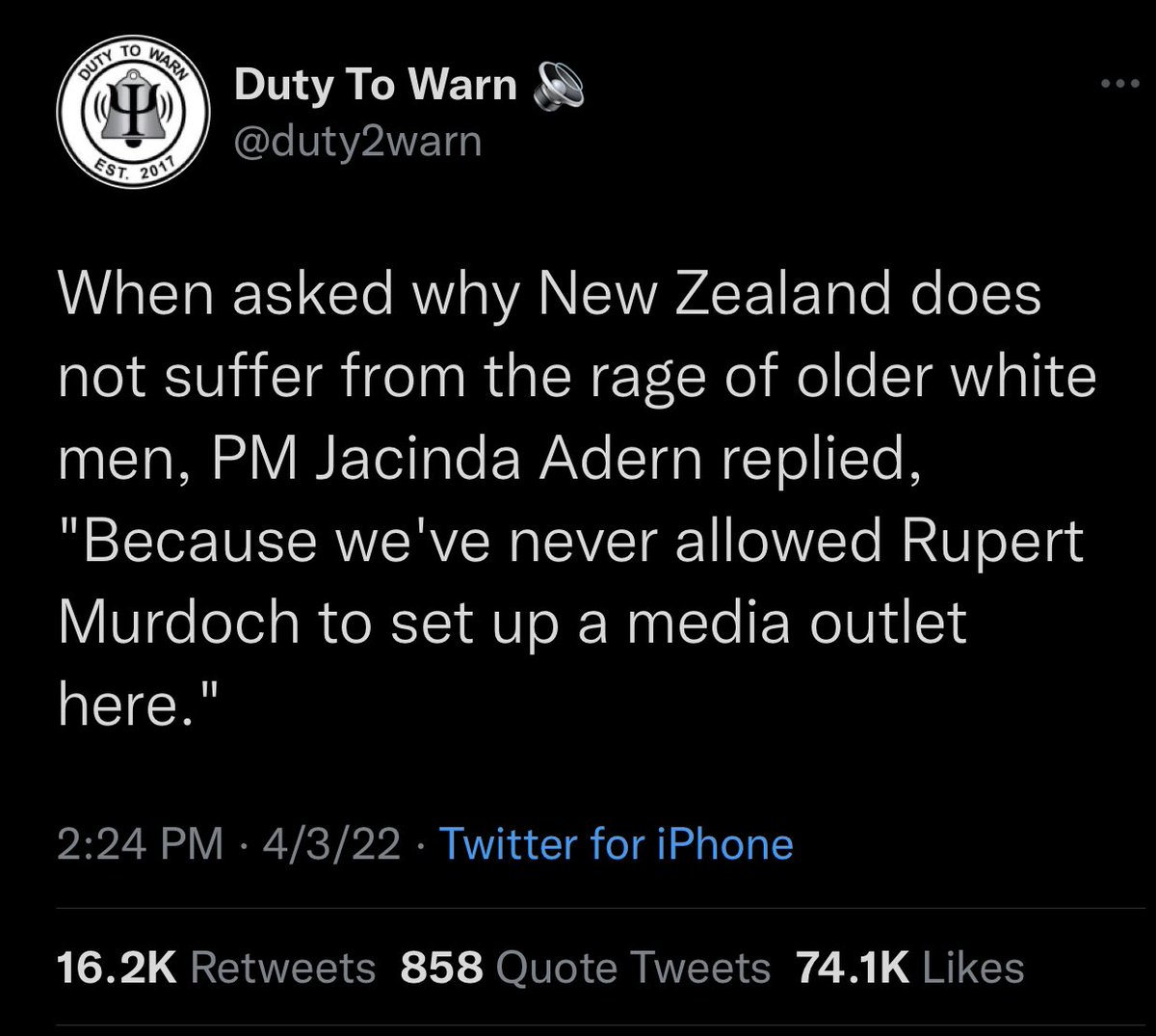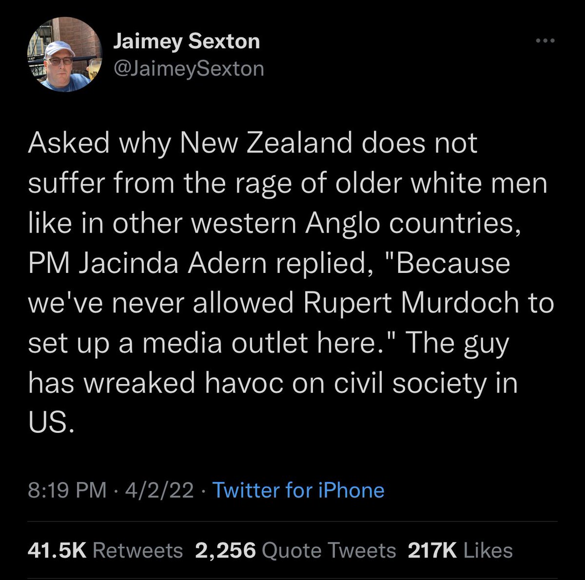There was a quote about Murdoch in a 2020 article about New Zealand rejecting populism, but it wasn't from Ardern. (And it wasn't specifically about "the rage of older white men," and it didn't say NZ "never allowed" Murdoch to set up a media outlet.) https://www.theguardian.com/world/2020/oct/19/why-new-zealand-rejected-populist-ideas-other-nations-have-embraced …pic.twitter.com/rgrCsgrXI0