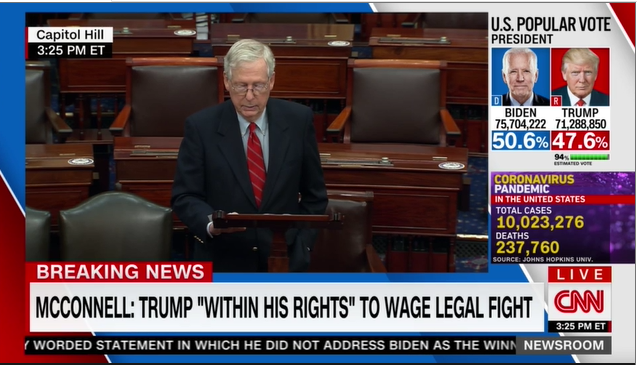 Ted Cruz amplified Guest's dishonest tweet, adding his own snarky comment. It's entirely baseless. Here are four additional screenshots from CNN coverage yesterday: https://twitter.com/tedcruz/status/1326152695326060546 …pic.twitter.com/KtsuqlwBPl