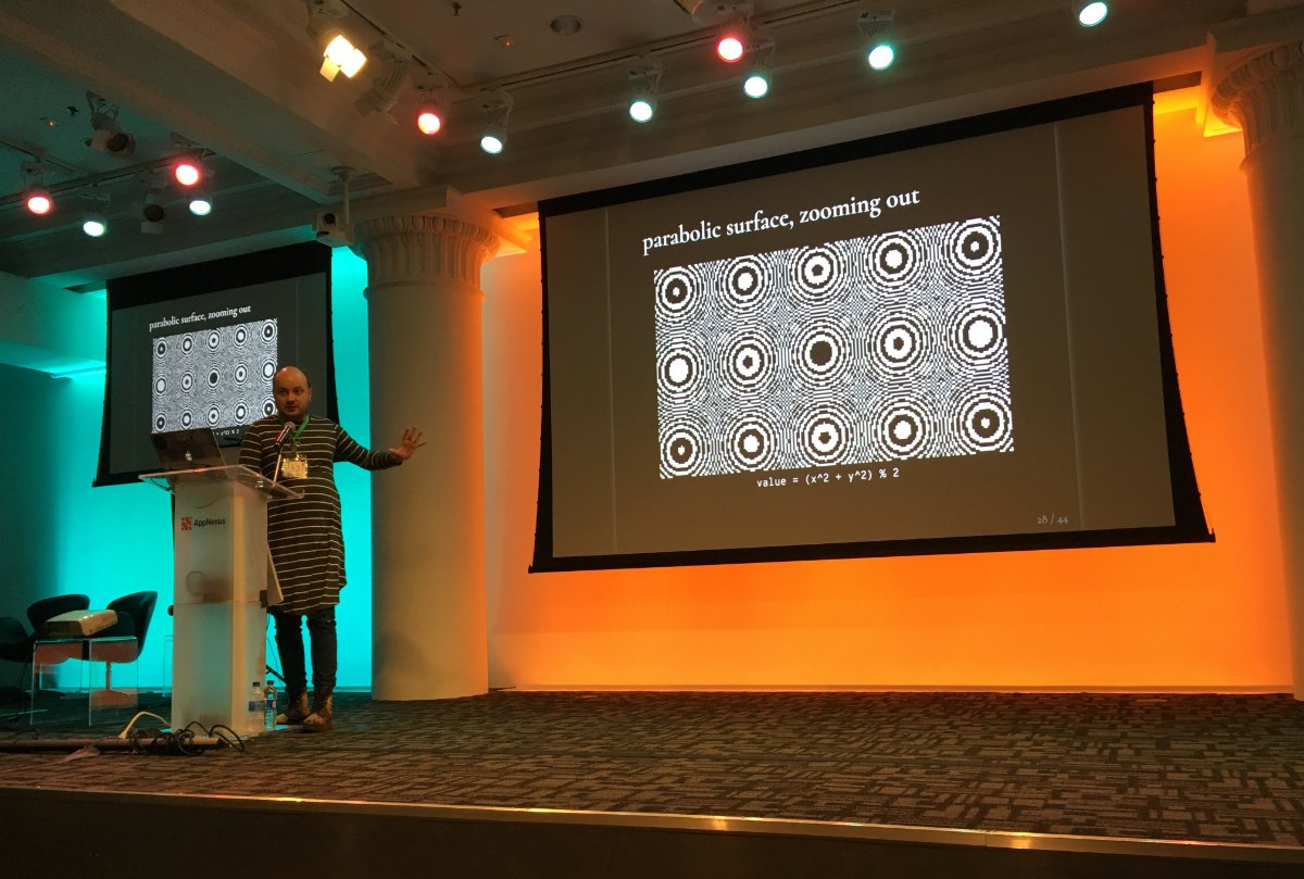 "as you zoom out, you start to get artifacts. They're called aliasing artifacts. They're sort of glitchy. As you zoom out more, they get more intense and weirder. Eventually they start to overwhelm the original image entirely and then it gets kind of trippy"