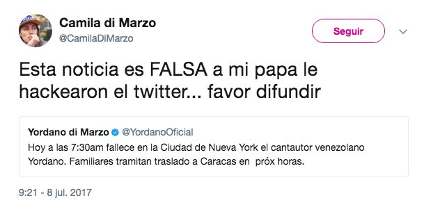 @camiladimarzo, hija de@YordanoOficial, desmiente muerte del cantante y afirma que hackearon su cuenta >> http://ow.ly/DAGG30dsN3q pic.twitter.com/V5B5SyKy52