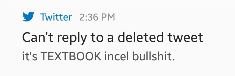 it's TEXTBOOK incel bullshit. why twitter is adamant that your tweet is deleted is beyond me...pic.twitter.com/FCf4yPV4N9