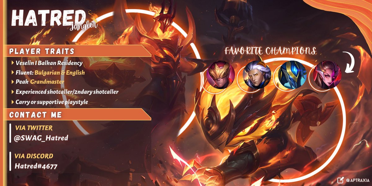 @AuxesisEsports i will be LFT for summer split. -Main shotcaller -Wide champion pool -Flexible playstyle You can contact me through a dm here or my discord Hatred#4677. If you need references dm me and i will provide them. RTs and Likes appreciated <3pic.twitter.com/sjE9wkZbnT