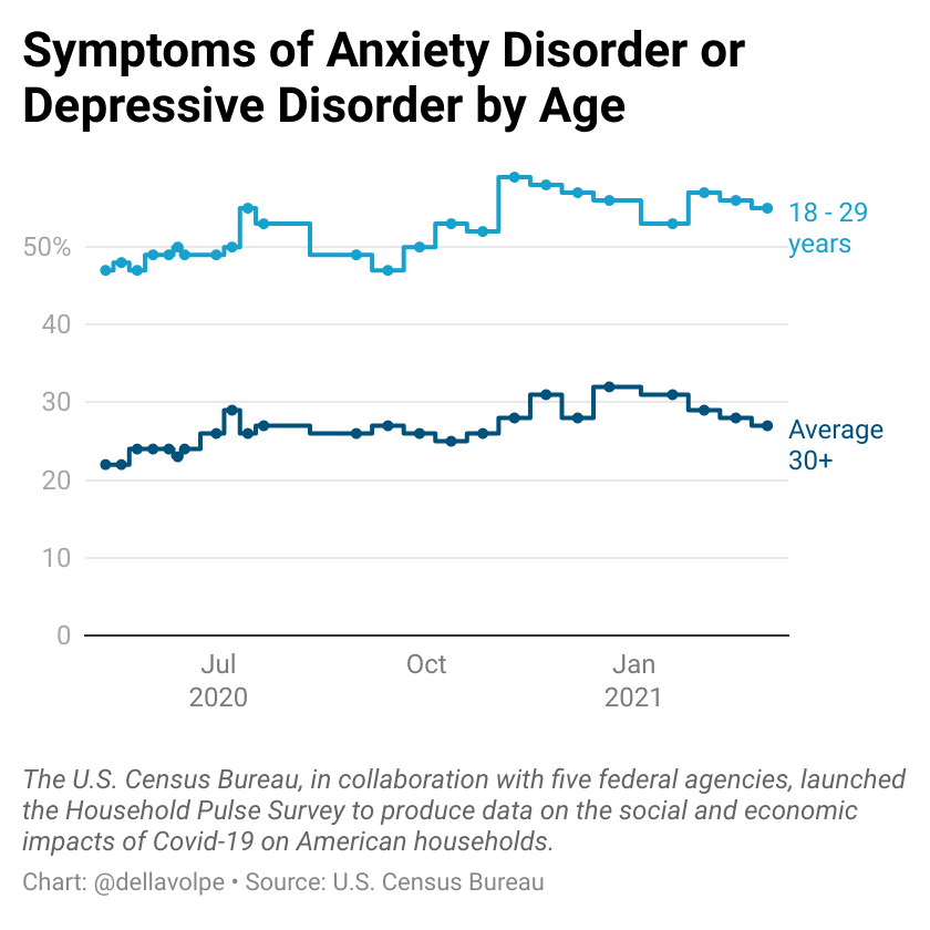 #GenZ and#millennials under 30 more than 2x as likely as everyone else to suffer from depression or anxiety, according to latest wave of@uscensusbureau Pulse Survey.#MentalHealthMatters#COVID19pic.twitter.com/jOzmG9O94i