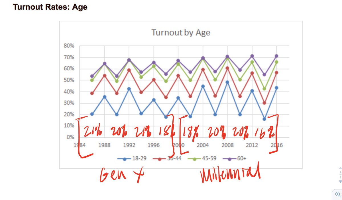Friendly reminder for the eye-rollers in their 40s and 50s who mock #millennials for not voting in midterms. You taught them well. Chart below shows why turnout even in the low to mid 20s will be meaningful improvement. #midterms #youthvotepic.twitter.com/jnnunu5MZ6