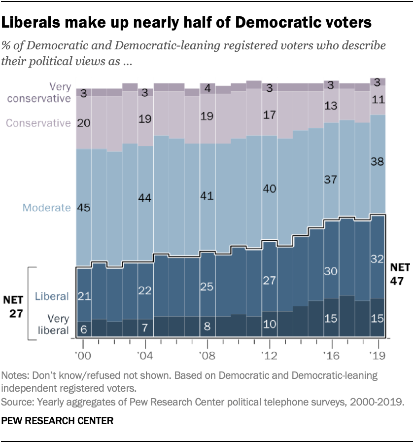 NEW on @FactTank: The share of Democratic voters who describe their political views as liberal has changed little over the past few years after increasing steadily between 2000 and 2016. https://pewrsr.ch/2NCcmOo  pic.twitter.com/bqntE9FHGk