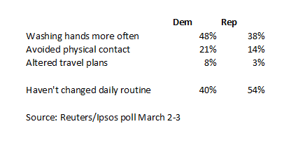 A Reuters/Ipsos poll found that Americans' preparations to deal with the new coronavirus turned in part on their political views. Democrats were more likely than Republicans to say they were washing their hands more, limiting contact with others and changing travel plans. pic.twitter.com/CoD5GjdxNx