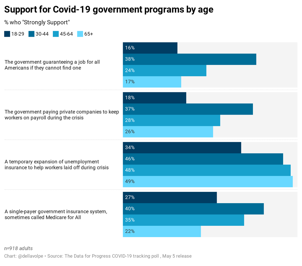 Hard to parse out during crisis I think, but more info & econ stress likely a role: Guaranteed work nets, as example: 18-29: 53% support, 29% oppose, 18% DK 30-44: 71%, 16%, 13% n~200, but still