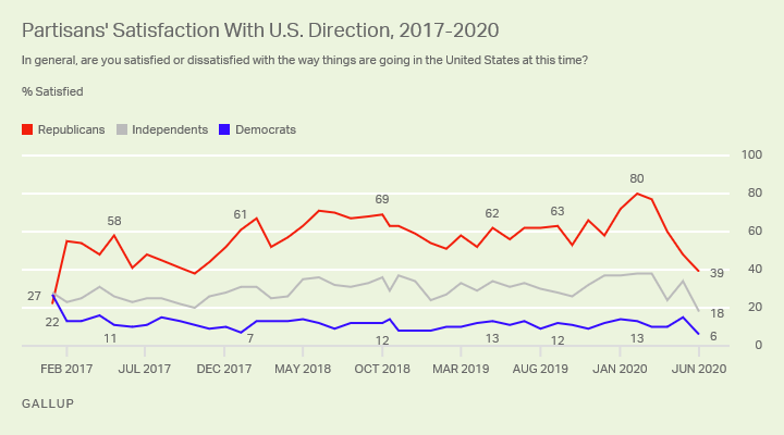 Stunning. Republicans are as dissatisfied with the way things are in the country today as they were when Obama was president. Satisfaction is less than half of what it was in January.https://twitter.com/crampell/status/1272556824554876929 …
