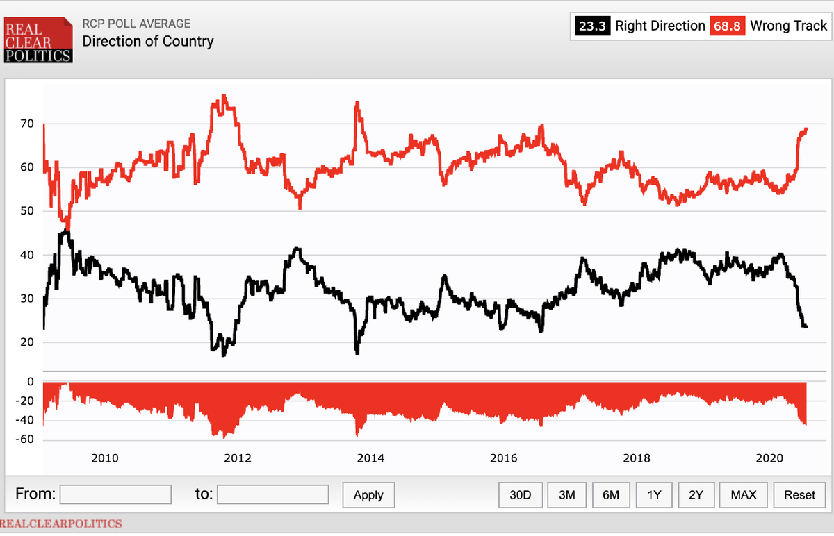 23% say country headed in right direction in @RealClearNews averages. Lowest point since the government shutdown over Obamacare and a school shooting in October 2013.pic.twitter.com/TTelbyimNJ