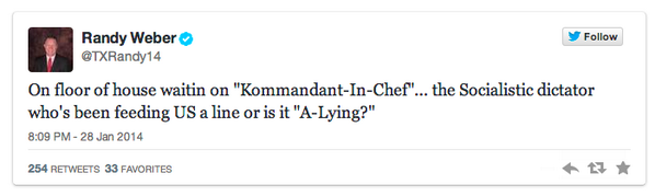 Klassy. RT @washingtonpost GOP lawmaker calls Obama "Kommandant-In-Chef" (sic) http://wapo.st/1ew3XAA #SOTUpic.twitter.com/p95G6yvEXg