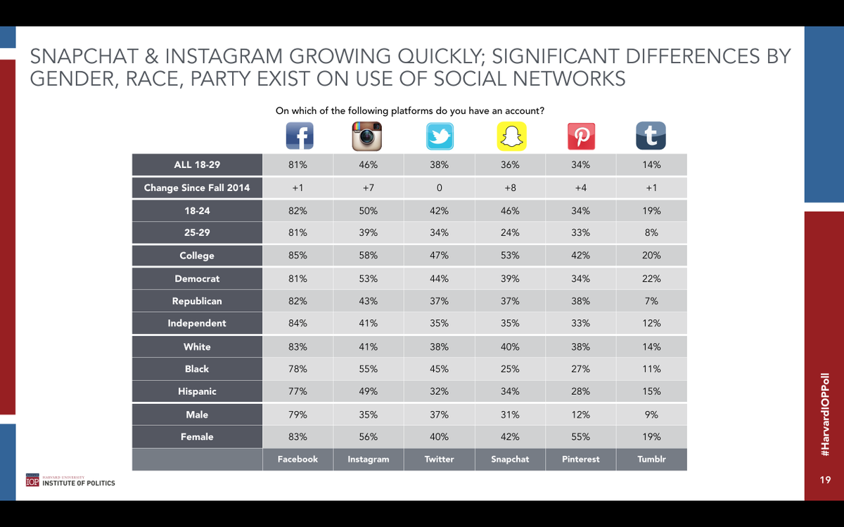Here's map for candidates seeking 2 connect w/ #Millennials. #HarvardIOPPoll Social Media x Party, Gender, Age, Racepic.twitter.com/VDo4arL3Nz
