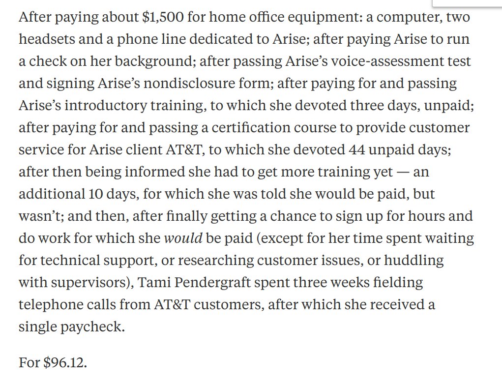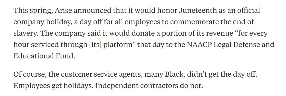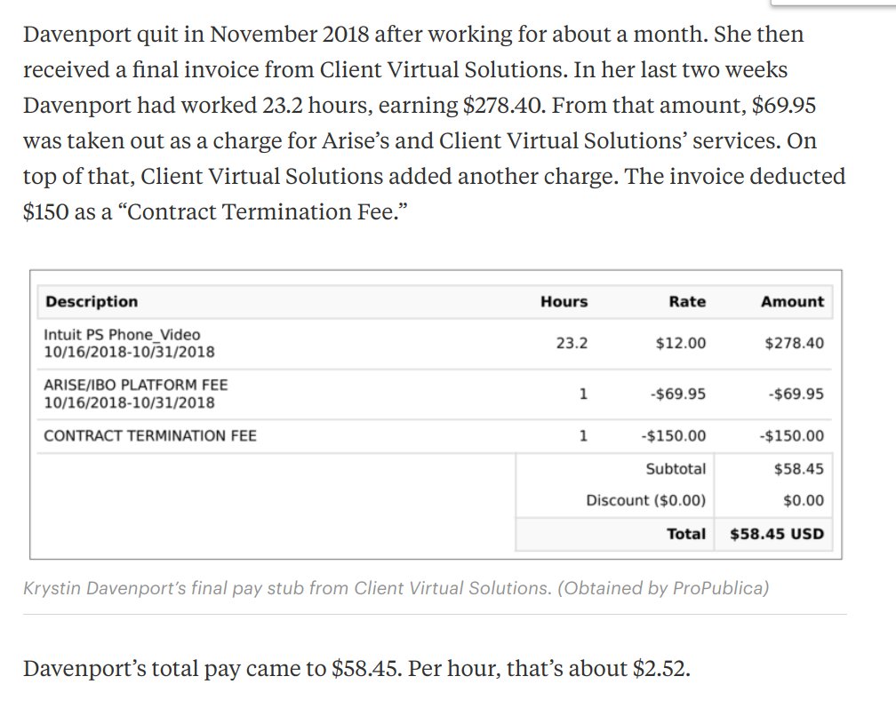 i finally finished this excellent piece of reporting on Arise, a shadowy customer service company that essentially applies the Uber model to call centers (in other words, fucking over workers). sharing some excerpts that help make the case for #NoOnProp22https://www.propublica.org/article/meet-the-customer-service-reps-for-disney-and-airbnb-who-have-to-pay-to-talk-to-you …