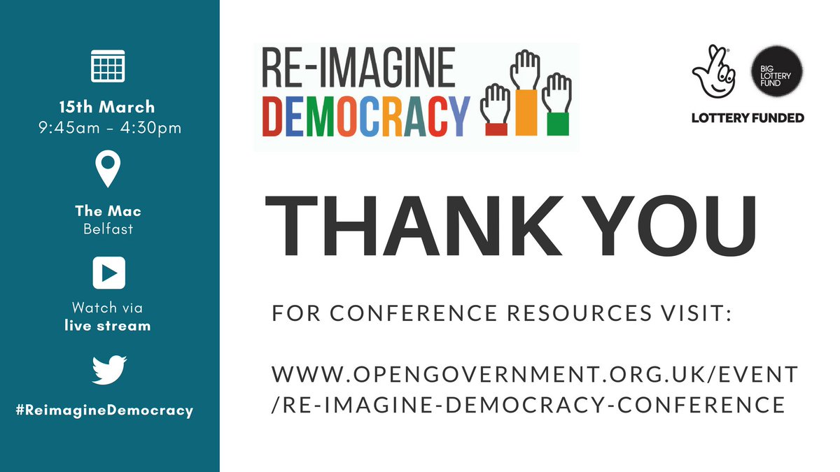 #ReimagineDemocracy - thanks to speakers, live stream & sound crews,@st_rochs@IDEAScotland@TheMACBelfast,@ImagineBelfast and@demsoclive for all your input and support! https://www.opengovernment.org.uk/ pic.twitter.com/Ae9wbDbRfG