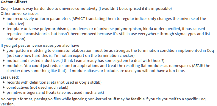 "Alpha Announcement: Coq is a Lean Typechecker"https://coq.discourse.group/t/alpha-announcement-coq-is-a-lean-typechecker/581 …