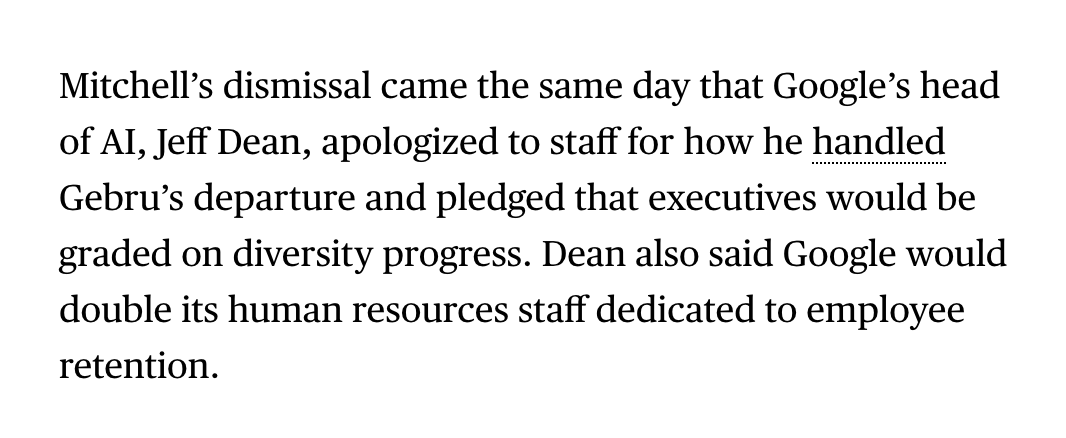 @JeffDean promising to do better after firing@timnitGebru then turning around and firing@mmitchell_ai THE VERY SAME DAY has got to set some sort of record. https://www.bloomberg.com/news/articles/2021-02-19/google-fires-researcher-meg-mitchell-escalating-ai-saga …pic.twitter.com/ebqVdRlvd6