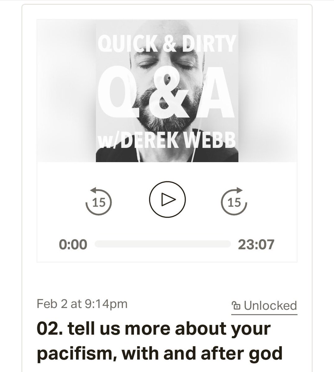 new episode of the ‘quick & dirty Q&A’ podcast is OUT. this week i spend 20 minutes tackling pacifism, both with & after god. get it (and so much more) here: http://patreon.com/derekwebb pic.twitter.com/XehDHiEQyA