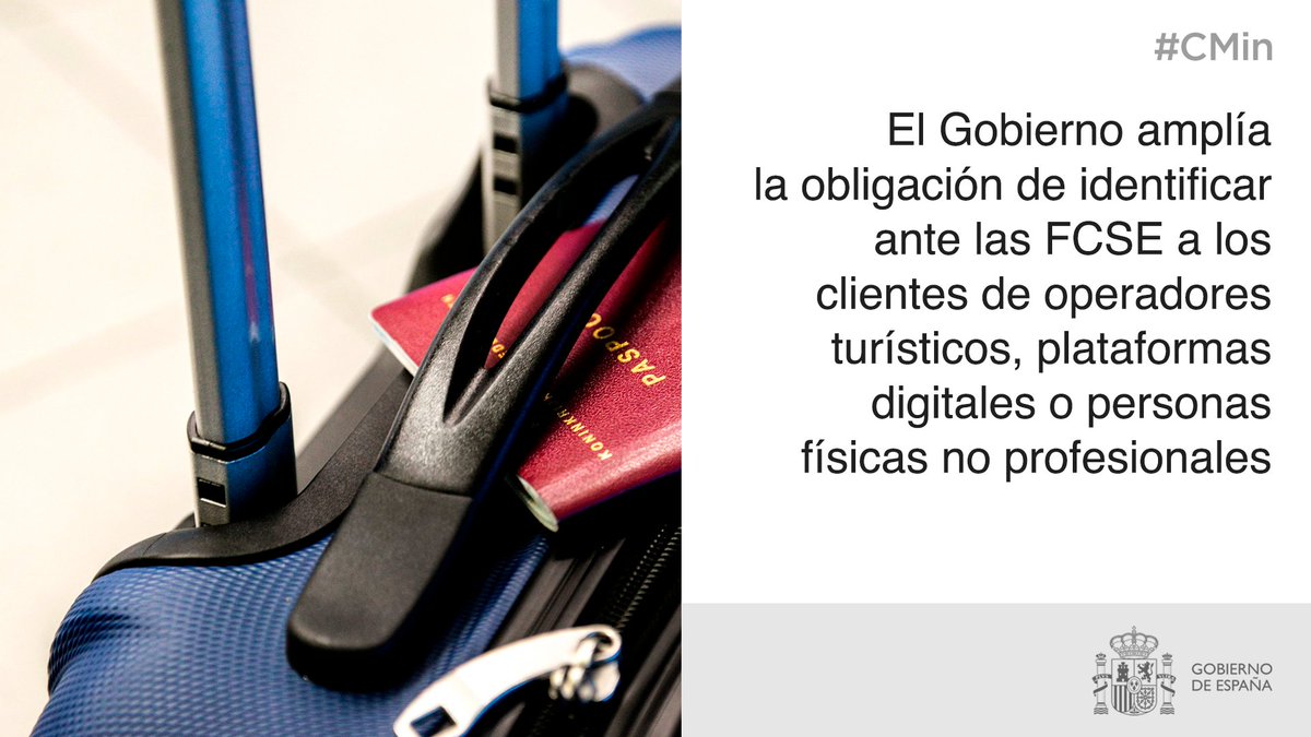 #CMin amplía la obligación de facilitar información a las FCSE sobre sus clientes a los operadores turísticos, plataformas digitales o personas físicas no profesionales, para: