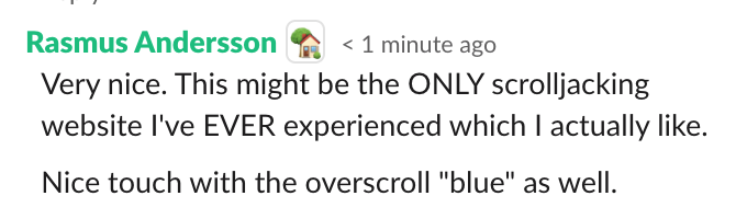 Thanks! The trick is to still have at least one element that’s grounded with the natural scroll—and never actually hijack the scroll, especially now that mobile Safari emits scroll events on release.