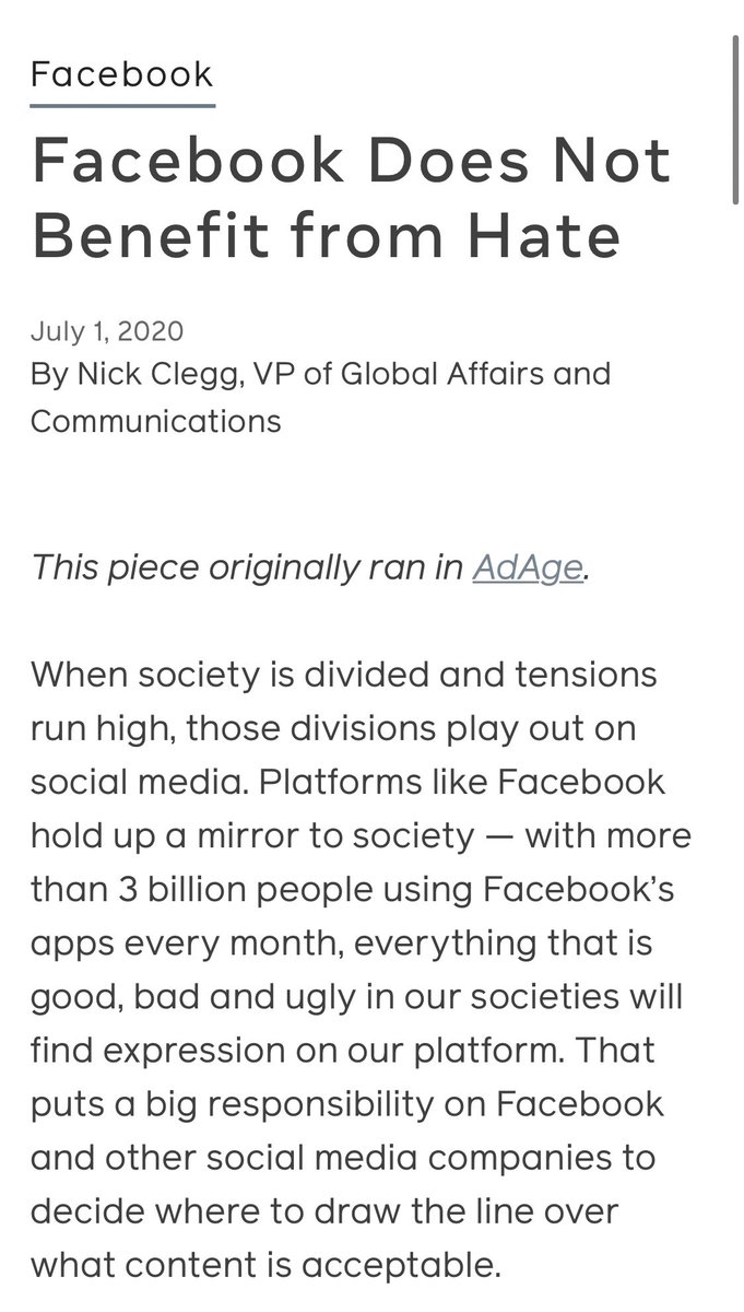 Yeah, they can't say it, but of course Facebook profits from incendiary ads and posts. Lots of research showing exponential engagement with controversial content.https://twitter.com/RMac18/status/1278359137525493760 …