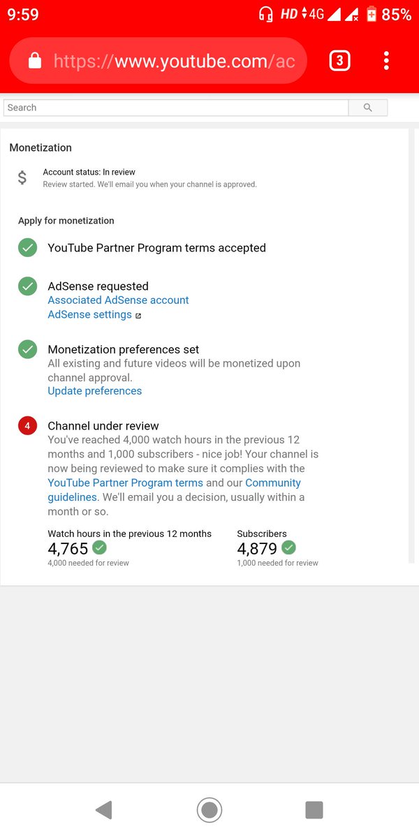 I have completed 4,000 hours of watch time and 1,000 Subscriber as per YouTube policies.