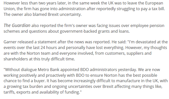 In September 2018 Norton Motorcycles owner Stuart Garner claimed he had no fears about Brexit, and said that it would be a "huge opportunity" to negotiate trade deals around the globe.pic.twitter.com/mXiZR3W94B