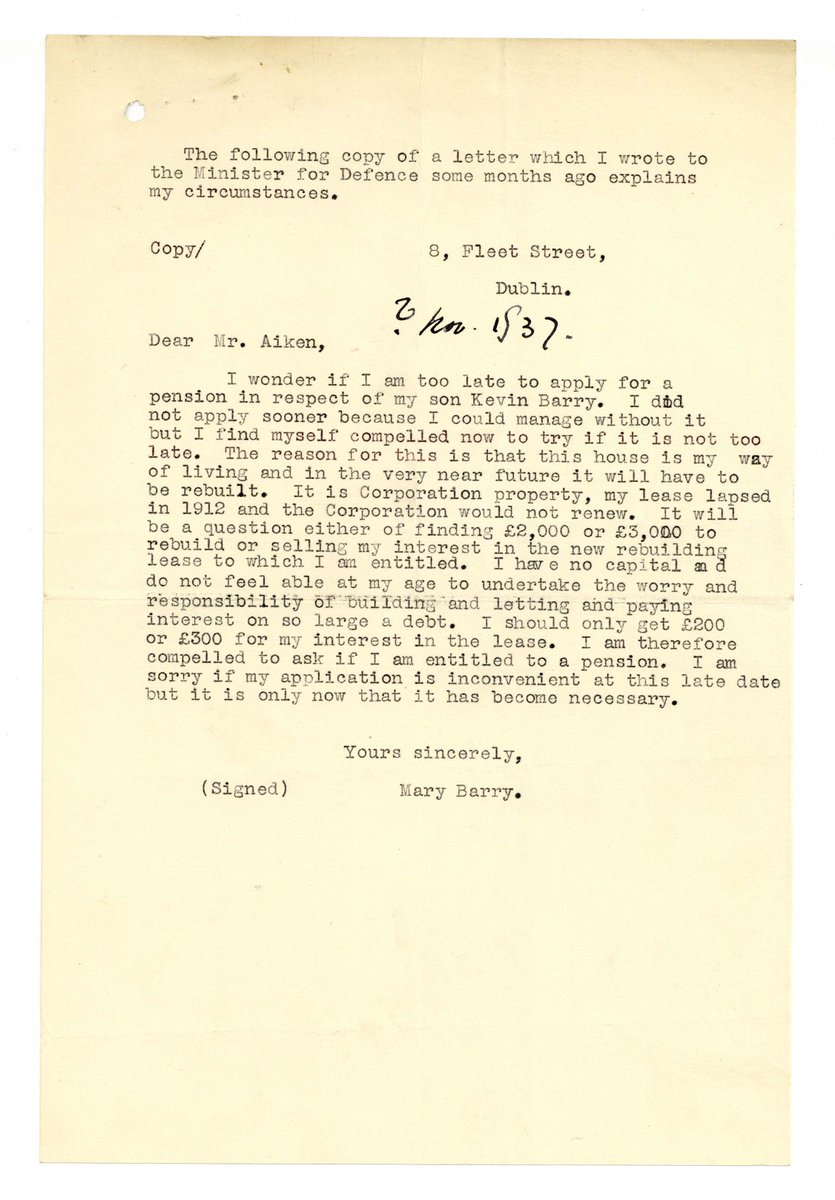 Copy letter of Mary Barry's unsuccessful application in respect of her son Kevin Barry executed at Mountjoy Prison, Dublin, Nov 1920