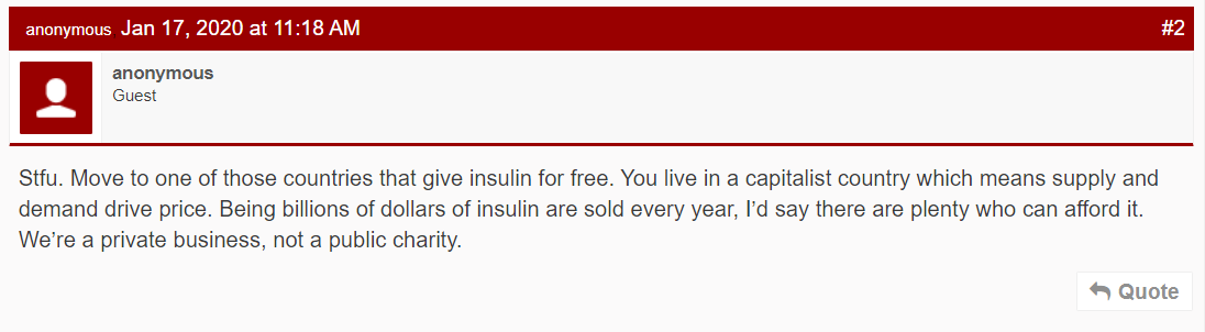 Bc when insulin dependent diabetics can’t afford basic insulin that Lilly alone prices at $300+ per vial, you know whose concerns we should be alleviating? Investors. I am DONE with pretending this is a “both sides” issue when we’re dying and Lilly is rolling in our blood money.https://twitter.com/kidfears99/status/1222919636263542784 …