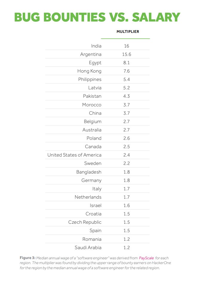 Not exactly sure what's causing the differences in data, but HackerOne's 2018 Hacker Report shows the ratio of bug bounty earnings to median wage for a software engineer for a number of regions, which shows a wildly different conclusion: https://www.hackerone.com/sites/default/files/2018-01/2018_Hacker_Report.pdf …pic.twitter.com/o5SP34bxcA