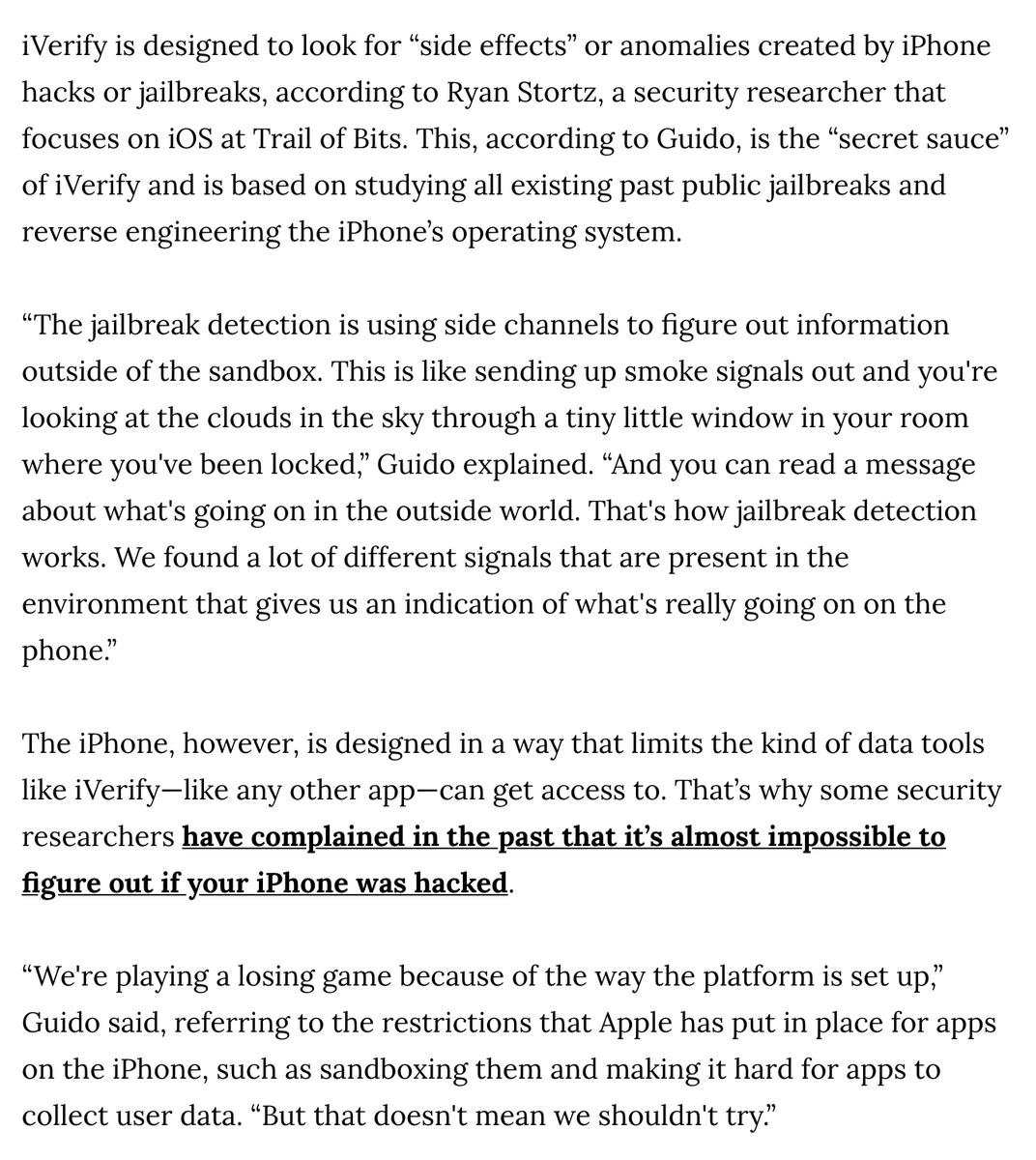 I explained how our jailbreak detection works this way to VICE. Most jailbreak detection simply checks a list of files, ensuring no false positives but many false negatives. We dialed up the sensitivity and report on any unknown anomalies.pic.twitter.com/kpZXLgbnHs