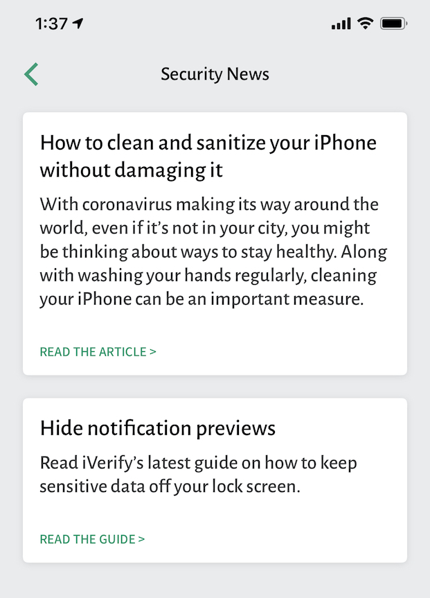 iVerify has a newsfeed! We'll publish only the highest-quality, most-specific iOS security news and guidance through the app.