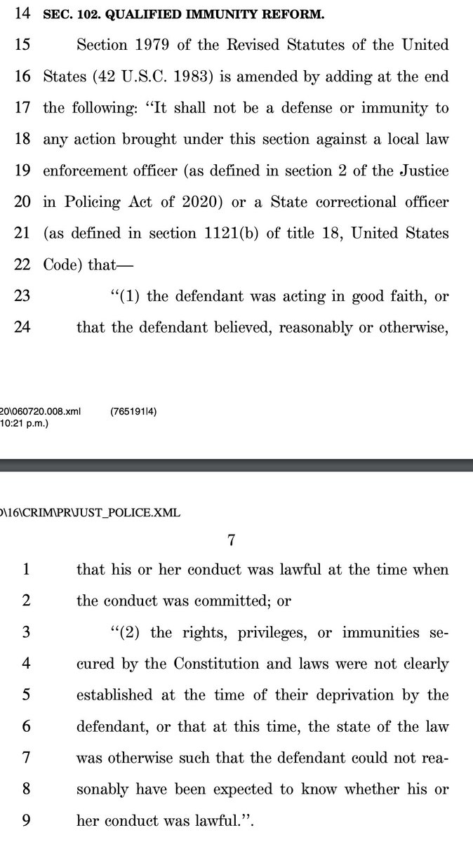 That's a good question, so I looked up the exact changes to the law. It looks pretty good to me! You can find the rest of the draft legislation here: https://judiciary.house.gov/uploadedfiles/justice_in_policing_act_of_2020.pdf …pic.twitter.com/OoCP23bwVE