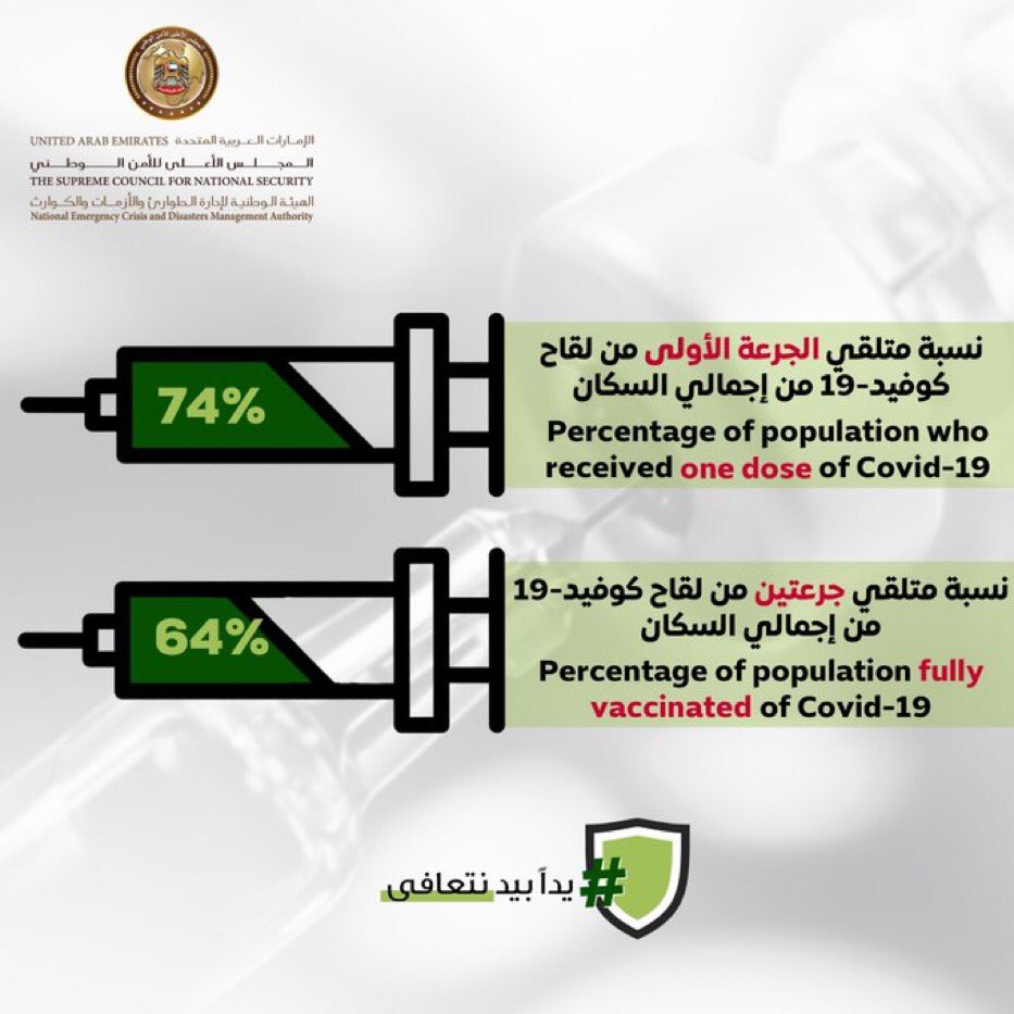 #كوفيد19 من إجمالي السكان 74%. ووصلت نسبة متلقي جرعتين من اللقاح من إجمالي السكان 64%.#البيان_القارئ_دائماpic.twitter.com/J8XKewa2oz