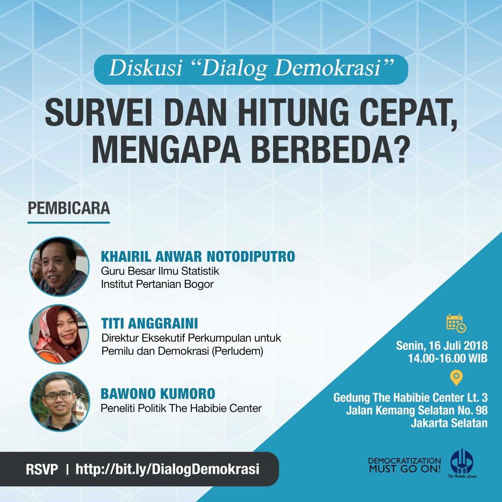 Berkat diskusi soal survei pra-pilkada dgn semua temans di twitter kemarin, besok Senin 16/7/2018 saya diminta bicara di The Habibie Center. Monggo saran dan masukannya, isu apa saja yg perlu diungkap dan dielaborasi besok. Terimakasih.