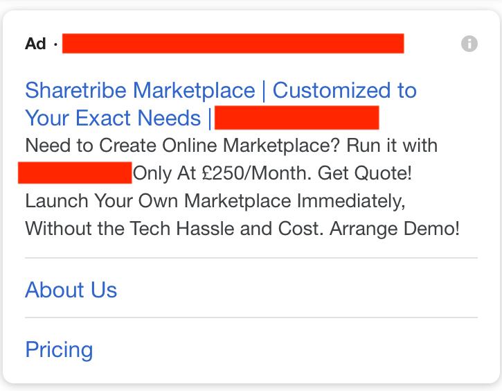 In consumers' interest, Google should also be much better at restricting the use of trademarks in the ad copy. We have competitors use our brand name in these ads in extremely misleading ways. You'd think that Google would be better at recognizing a trademark like "Sharetribe".pic.twitter.com/v973PSAS1I