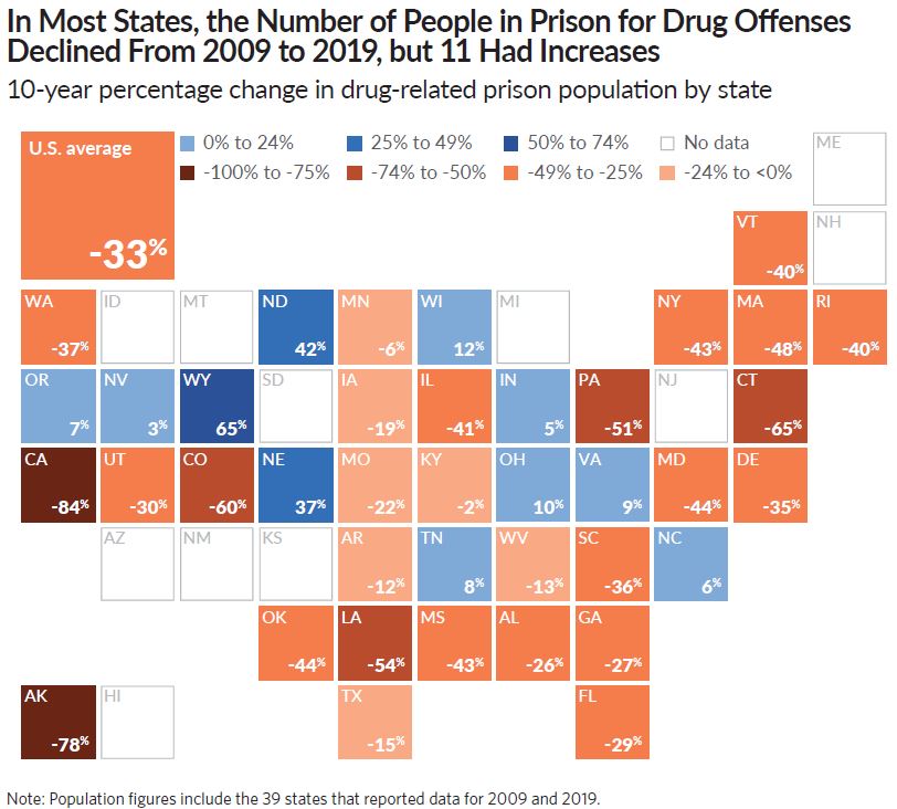 Bucking the nationwide trend, several states saw their drug-related prison populations grow from 2009 to 2019. Some by at least a third. See your state's data (or lack thereof). https://pew.org/3p2xFeF