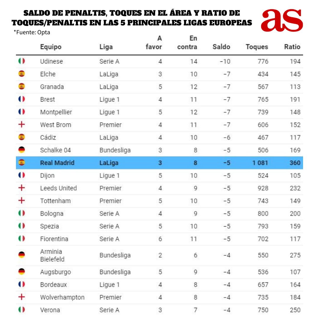 El #RealMadrid cerró la temporada con el octavo peor balance de penaltis de los 98 equipos de las cinco grandes ligas europeas y el tercero de#LaLiga