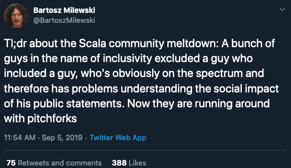 What really frustrates me is that as I try to engage with people in various communities (Scala notwithstanding) there's such a resistance to learn, a resistance to empathize with people. "Tolerance" isn't the answer I think, but knowing what to be intolerant of.