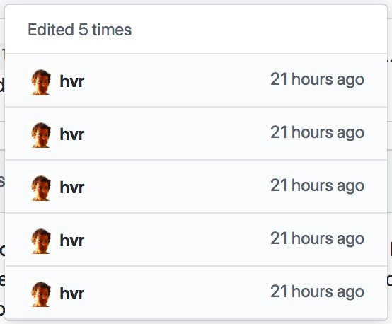 Not sure where you got those time stamps. These are the real ones: - 2018-02-13T18:22:26Z - 2018-02-13T18:24:38Z - 2018-02-13T18:25:12Z - 2018-02-13T18:26:36Z - 2018-02-13T18:29:56Z - 2018-02-13T18:44:49Z About 22 minutes elapsed between the original comment and the final edit.