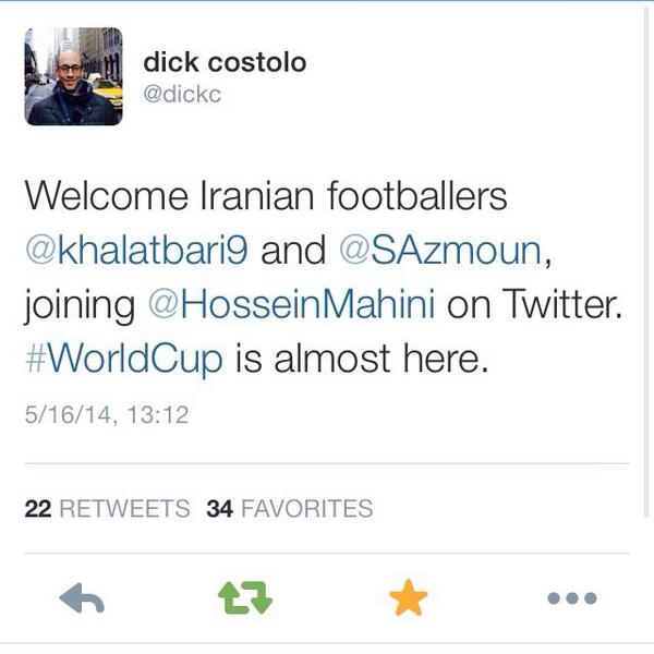“@dickc: Welcome Iranian footballers @khalatbari9 and @SAzmoun, joining @HosseinMahini on Twitter.#WorldCup is almost here.”thank you @dickc