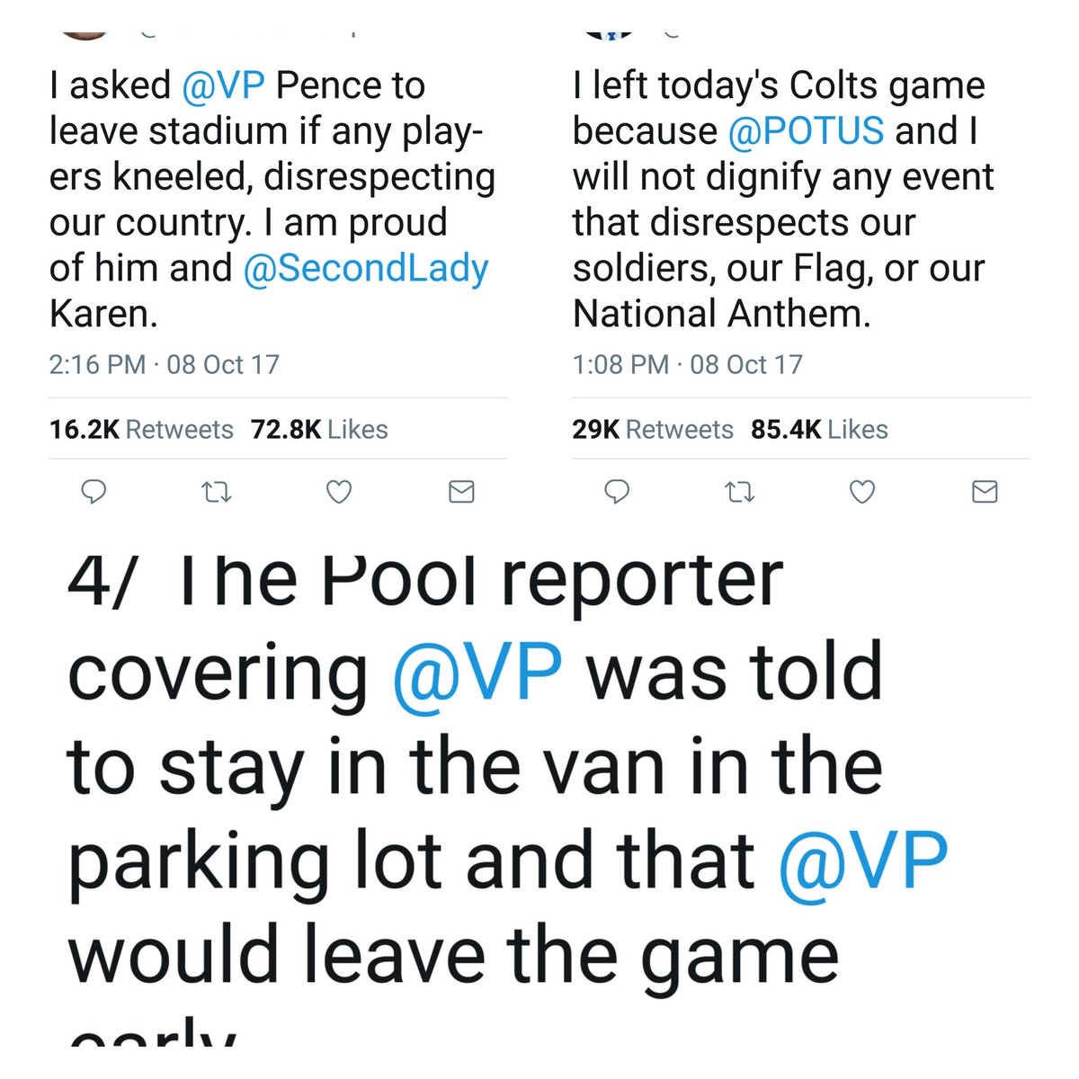 Pence is OUTRAGED that a few NFL players took a knee before a football game, SILENT about white supremacist rally in Charlottesville last night as they say. I agree!! As if he didn't know they would kneel! Whose looking for attention???.
