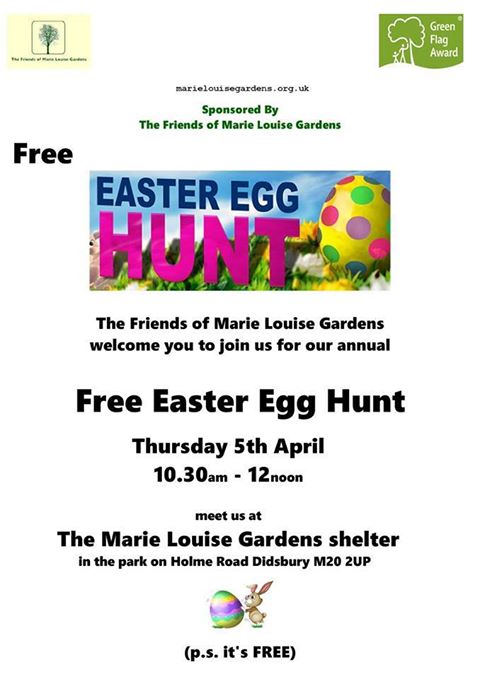 #Easter Egg Hunt in Marie Louise Gardens,#Didsbury on Thursday 5th April. Full details on flyer...pic.twitter.com/RGF7KM0XsA