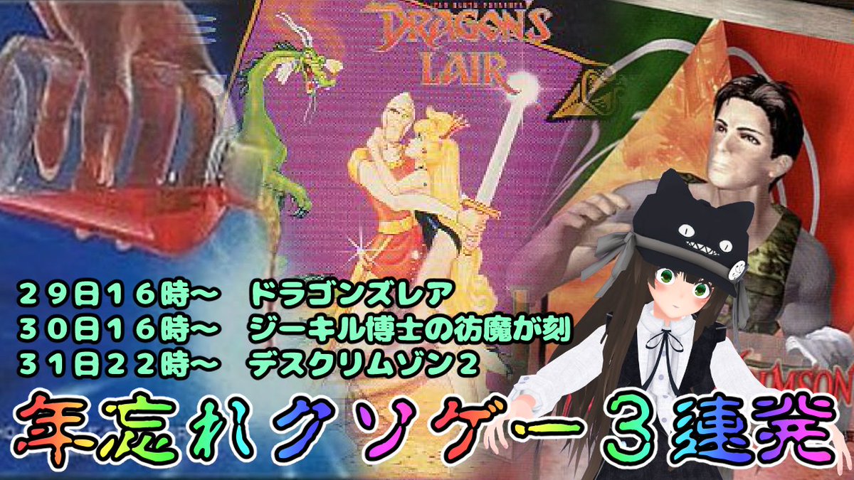 〈年末の配信告知〉 今年も年末は3日連続クソゲー配信! 29日16時~ クソの門前払い『ドラゴンズレア』 30日16時~ クソの二重人格『ジーキル博士の彷魔が刻』 31日22時~ 赤いクソふたたび『デスクリムゾン2』 以上のようになってます みんな!年末はクソゲーよりにじさんじの特番を見よう!pic.twitter.com/EZgKdm1RWZ