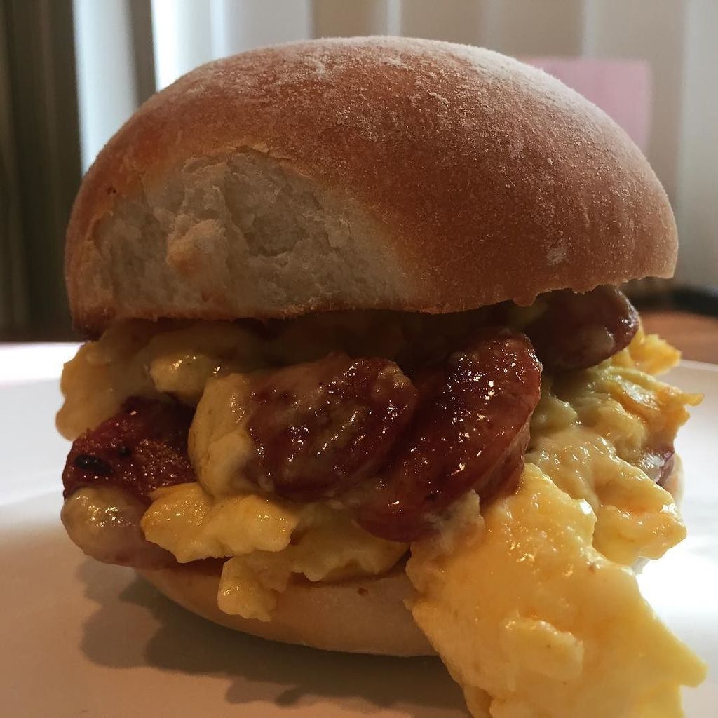An eggy brunch: Linguica sausage and cheddar scrambled eggs on a roll. http://ift.tt/1Lzb393 pic.twitter.com/9K3herOFRF