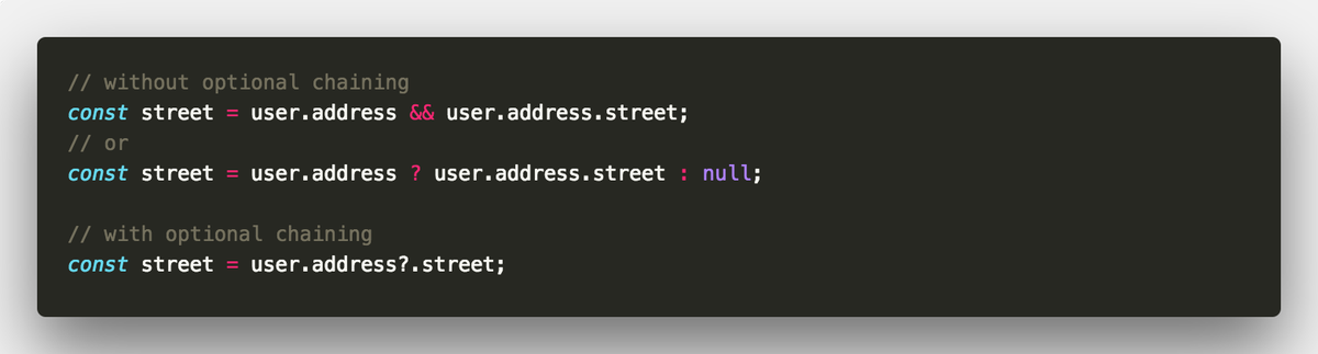 #javascript feature I am really looking forward to is optional chaining. https://github.com/tc39/proposal-optional-chaining …pic.twitter.com/61CWH5dgw0